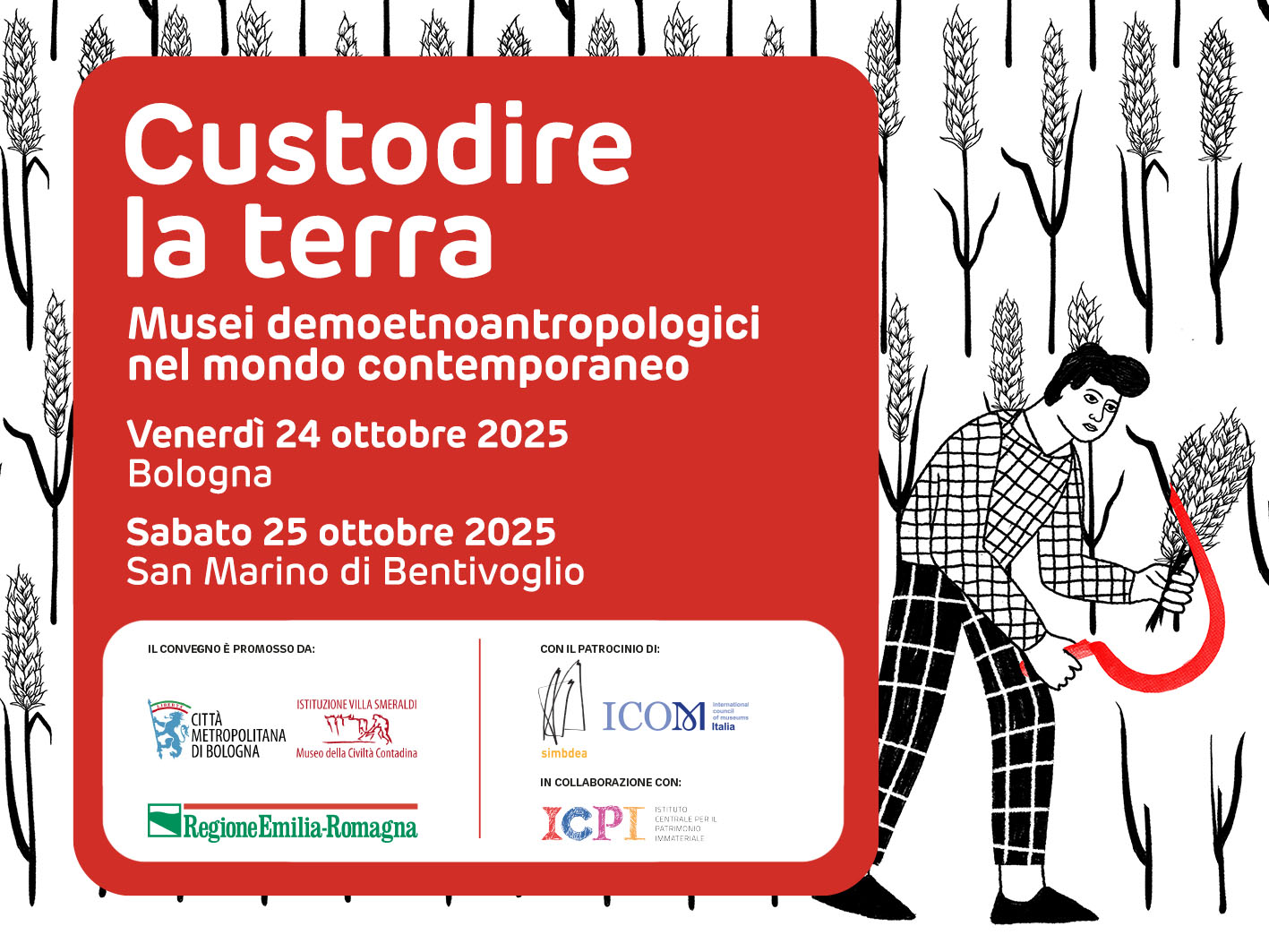 Custodire la Terra: Musei demoetnoantropologici nel mondo contemporaneo è un importante momento di riflessione e confronto dedicato al patrimonio culturale rurale e alle sue trasformazioni. Una due giorni interattiva con panel, laboratori e tavoli di lavoro, organizzato a 50 anni dal dal Convegno nazionale di Museologia Agricola, svoltosi nel 1975 a Bologna e presso Villa Smeraldi a San Marino di Bentivoglio.