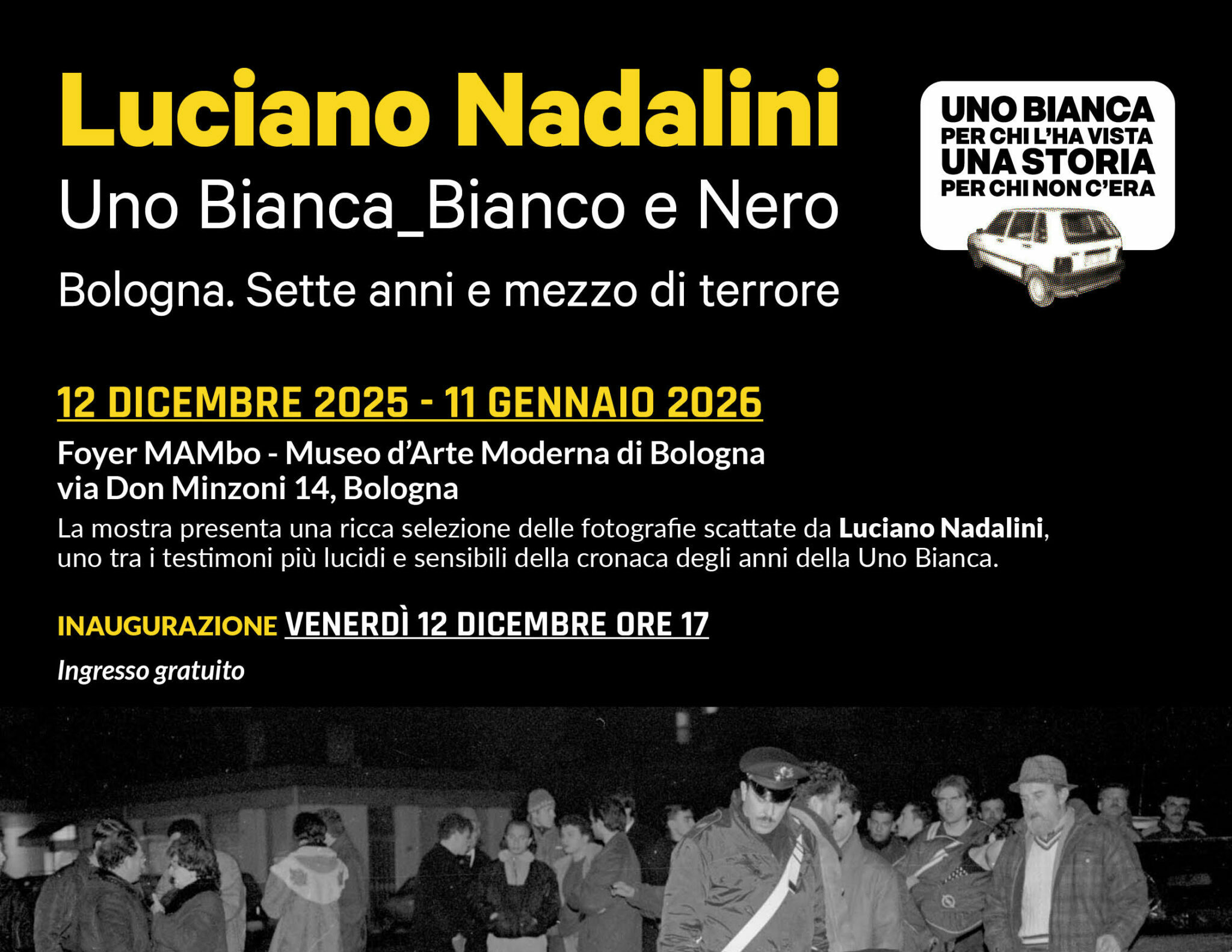Il 12 dicembre inaugura al MAMbo la mostra Uno bianca. Bianco e nero. Sette anni e mezzo di terrore di Luciano Nadalini, parte del progetto Uno bianca per chi l'ha vista. Una storia per chi non c'era a cura dell'Associazione Vittime della Uno Bianca. Uno dei...
